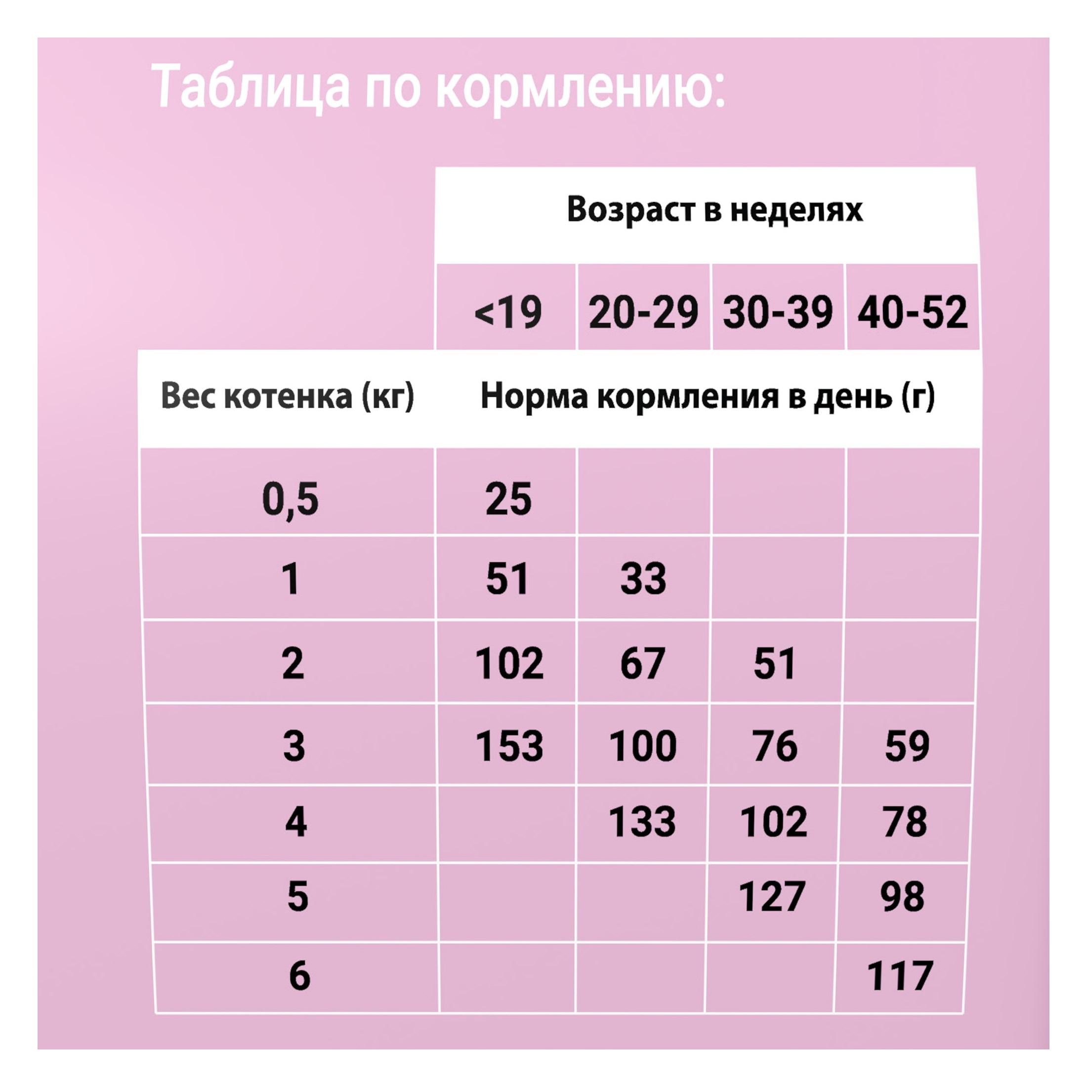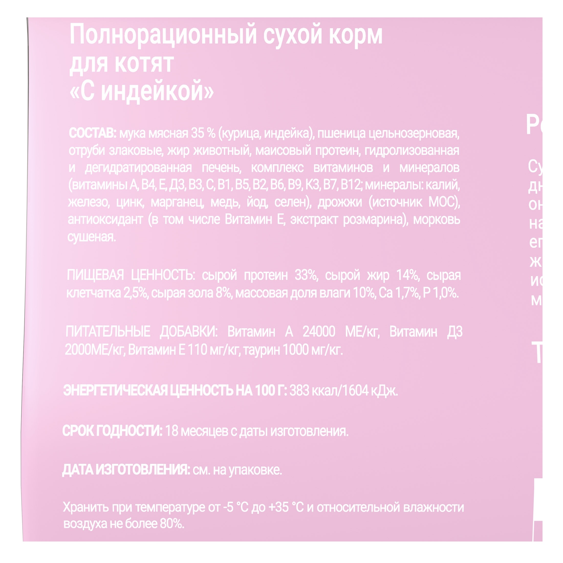 Полнорационный сухой корм для котят с индейкой Мясо — ингредиент №1 Активный рост Правильное развитие Высокое содержание таурина Комплекс витаминов и минералов Мясная мука — полноценный источник белка. Мясной протеин с полноценным аминокислотным составом обеспечивает поддержку мышц. Комплекс витаминов и минералов (А, В4, Д3, Е, В3, С, В1, В5, В2, В6, В9, К3, В7, В12 калий, железо, цинк, марганец, медь, йод, селен) способствует быстрому обновлению шерсти в период сезонной линьки, повышению активности иммунитета. Витамин Е — повышает защитные функции организма, оказывает благотворное влияние на нервную, сердечную и сосудистую системы. Розмарин — обладает противовоспалительным эффектом, нейтрализует действие свободных радикалов, укрепляет иммунитет и повышает общий тонус организма. Таурин — способствует нормальному пищеварению, укрепляет иммунитет и улучшает зрение, нормализует работу сердечной мышцы. Омега-3 и Омега-6, органический цинк — обеспечивают здоровую кожу и блестящую мягкую шерсть.
