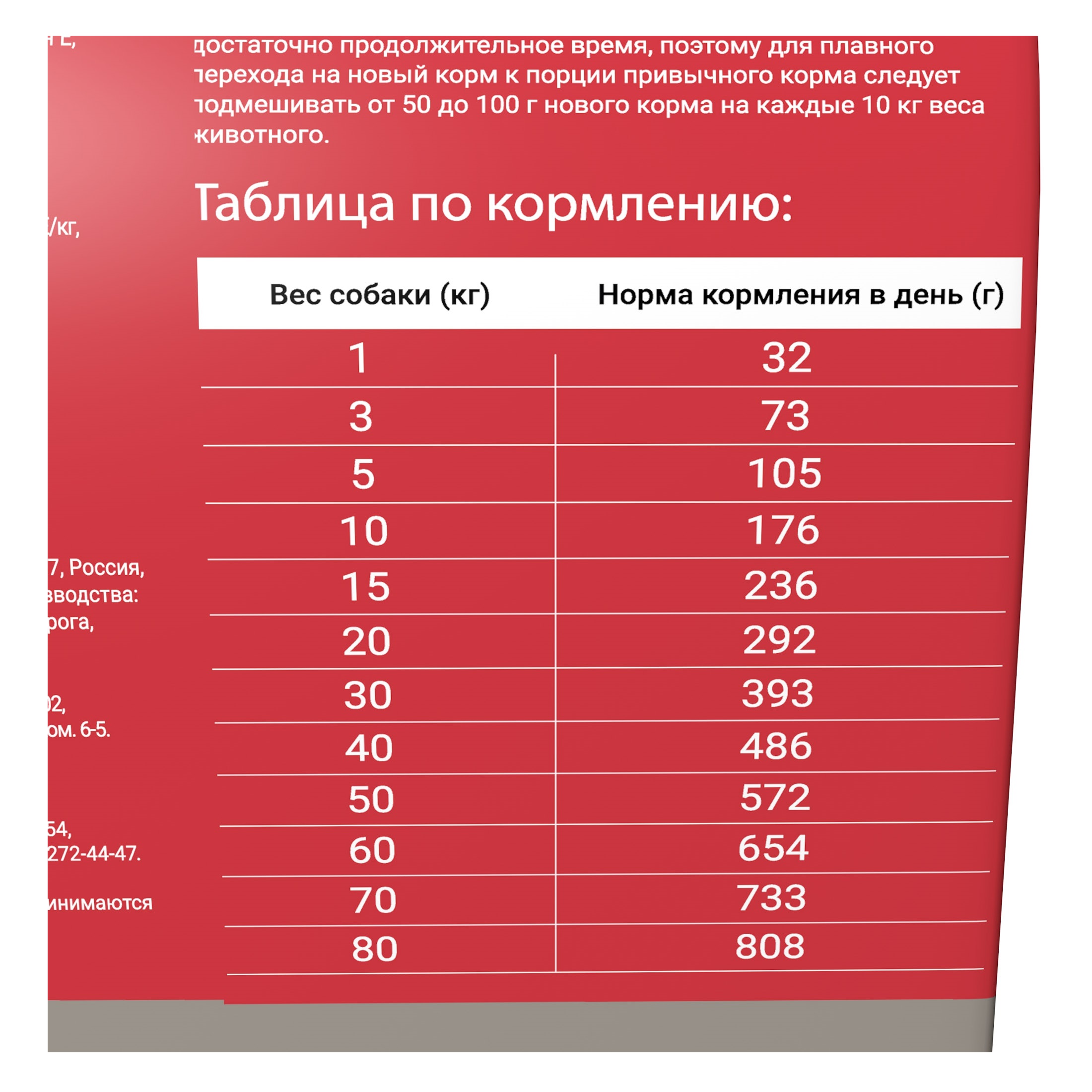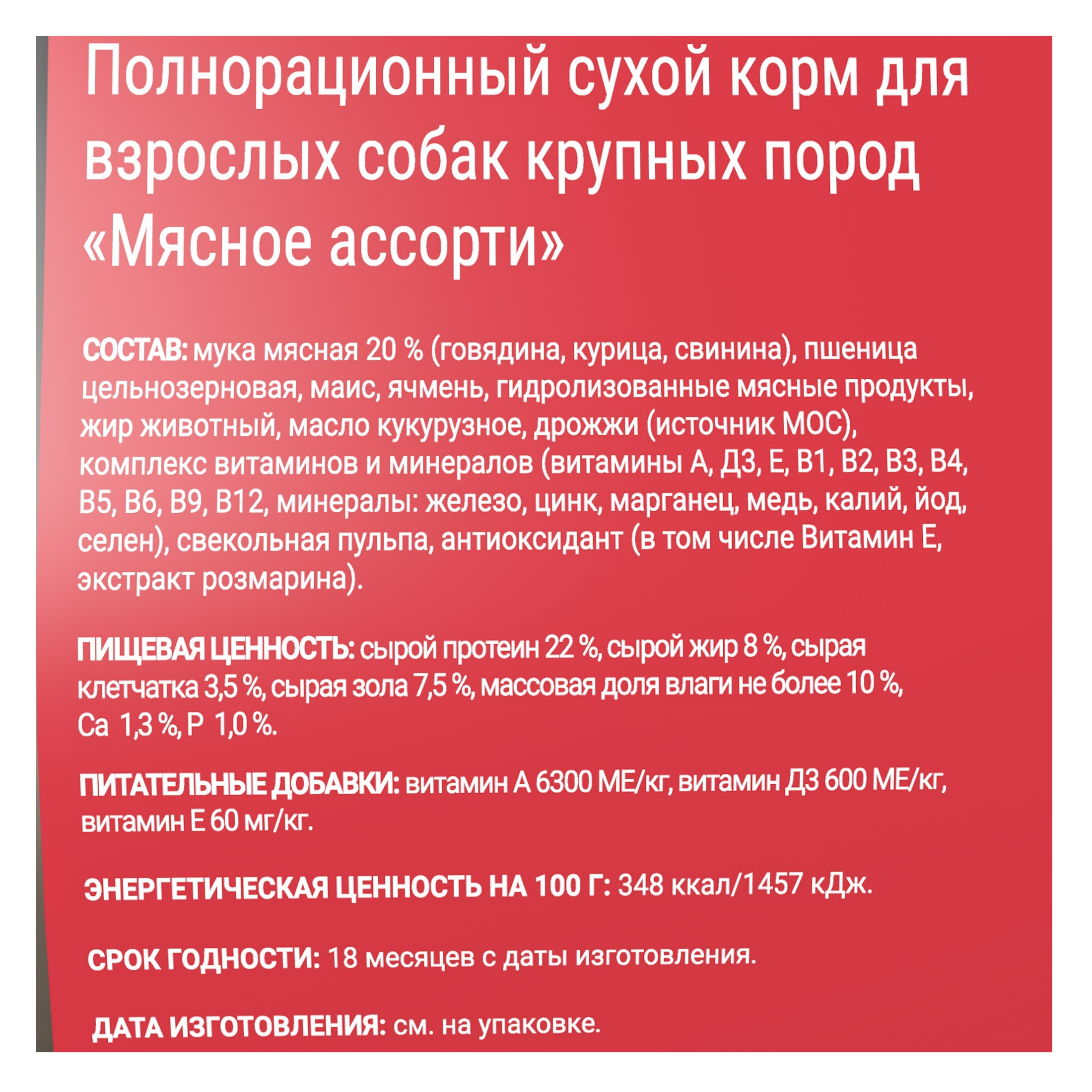 Состав: Мука мясная 20% (говядина, курица, свинина), пшеница цельнозерновая, маис, ячмень, гидролизованные мясные продукты, жир животный, масло кукурузное, дрожжи (источник МОС), комплекс витаминов и минералов (Витамины А, Д3, Е, В1, В2, В3, В4, В5, В6, В9, В12, минералы: Железо (Fe), Цинк (Zn), Марганец (Mn), Медь (Cu), Калий (K), Йод (I), Селен (Se) (Se) (Se)), свекольная пульпа, антиоксидант (в том числе Витамин Е, экстракт розмарина).