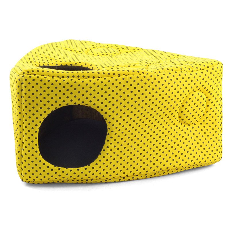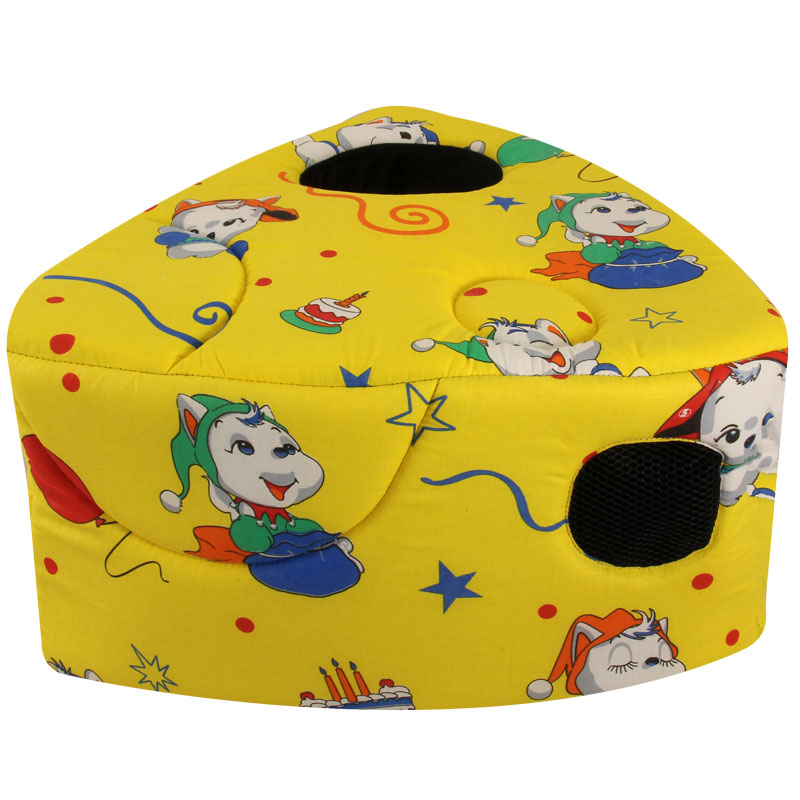 Домик для кошек и собак мелких пород выполнен в форме кусочка сыра. Мягкий и приятный на ощупь, изделие на поролоновой основе отделано яркой и практичной бязью. Домик имеет два отверстия, одно из которых сквозное, а другое - с сеткой. Домик легко стирается в обычной стиральной машине, его удобно брать с собой на дачу или в длительную поездку - он не занимает много места. Размер изделия: 480*480*270мм. Цвет: желтый.