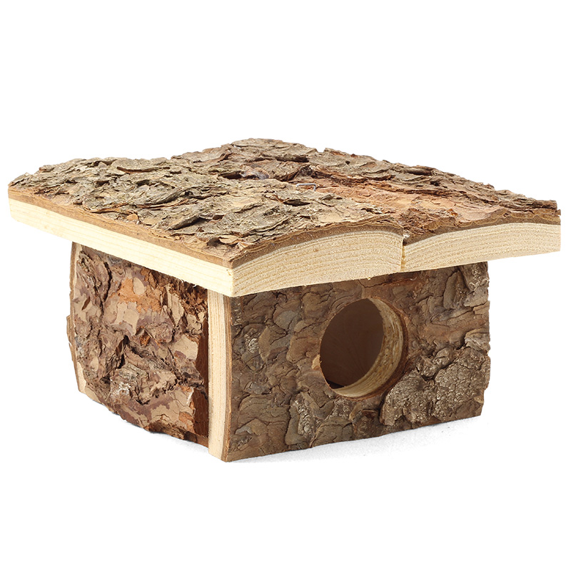 Домик с одним входом, прямой крышей и торцевым окошком изготовлен из натуральной древесины с сохранением внешнего слоя коры. Технология медленной сушки позволяет достигнуть необходимой влажности изделия для сохранения внешного вида и долгосрочного хранения. Изделие экологически безопасно для питомца и выполняет в том числе декоративную функцию, являясь оригинальным украшением для клетки. Конструкция в сборе имеет высоту 9 см при габаритах 18х14,5 см.