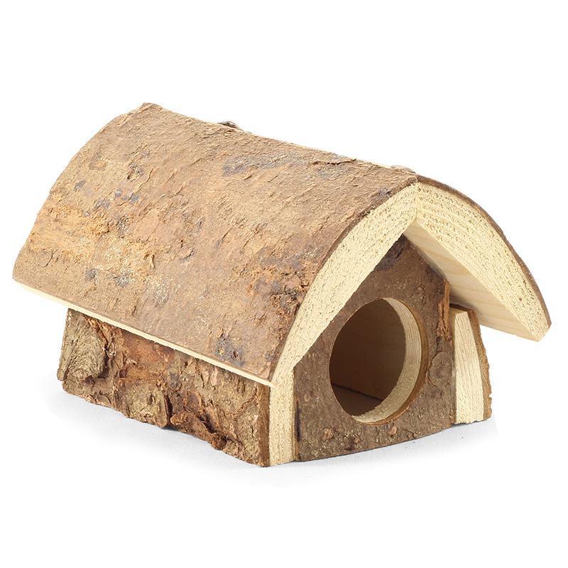Домик-избушка с круглым входом и покатой крышей изготовлен из натуральной древесины с сохранением внешнего слоя коры. Технология медленной сушки позволяет достигнуть необходимой влажности изделия для сохранения внешного вида и долгосрочного хранения. Изделие экологически безопасно для питомца и выполняет в том числе декоративную функцию, являясь оригинальным украшением для клетки. Конструкция в сборе имеет высоту 10 см при габаритах 16х12 см.
