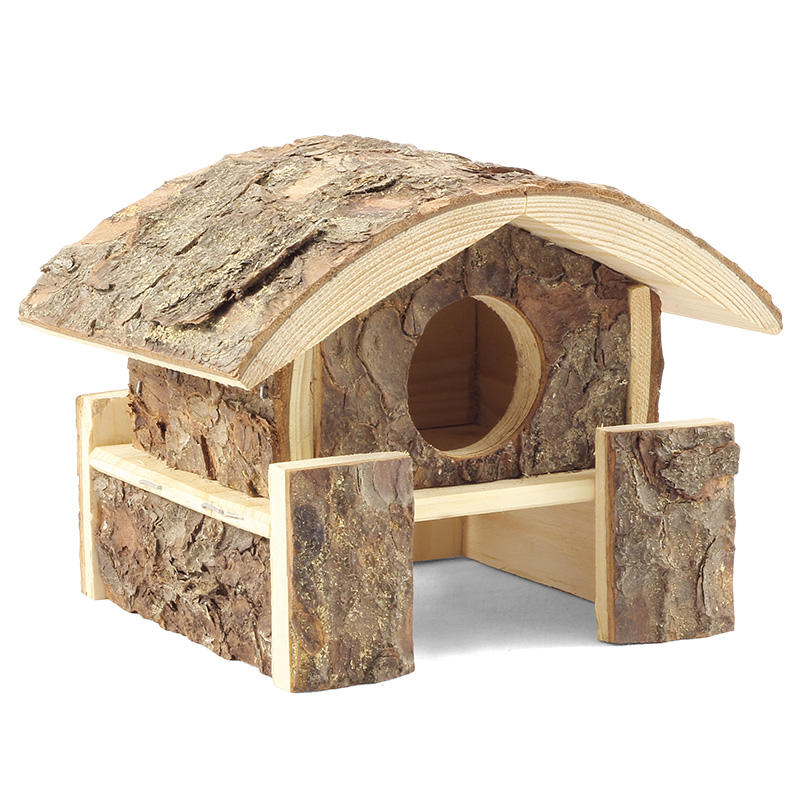 Домик с круглым входом и покатой крышей возвышается на помосте, который становится дополнительным элементом исследования для вашего питомца. Домик изготовлен из натуральной древесины с сохранением внешнего слоя коры. Технология медленной сушки позволяет достигнуть необходимой влажности изделия для сохранения внешного вида и долгосрочного хранения. Изделие экологически безопасно для питомца и выполняет в том числе декоративную функцию, являясь оригинальным украшением для клетки. Конструкция в сборе имеет высоту 14 см при габаритах 15х14,5 см.