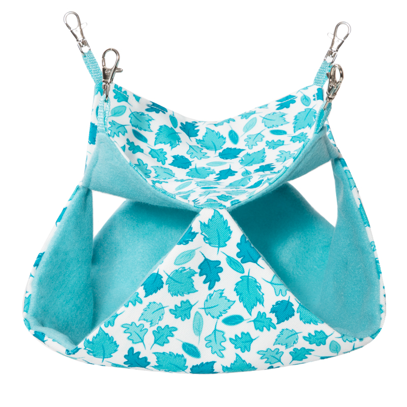 Двухъярусный гамак приятной расцветки для мелких животных станет любимым местом отдыха вашего питомца. Сшит из материала, который легко моется и чистится. Изделие подвешивается в любом месте внутри клетки при помощи карабинов. Цвет: бело-бирюзовый. Размер гамака: 335*335*10мм.