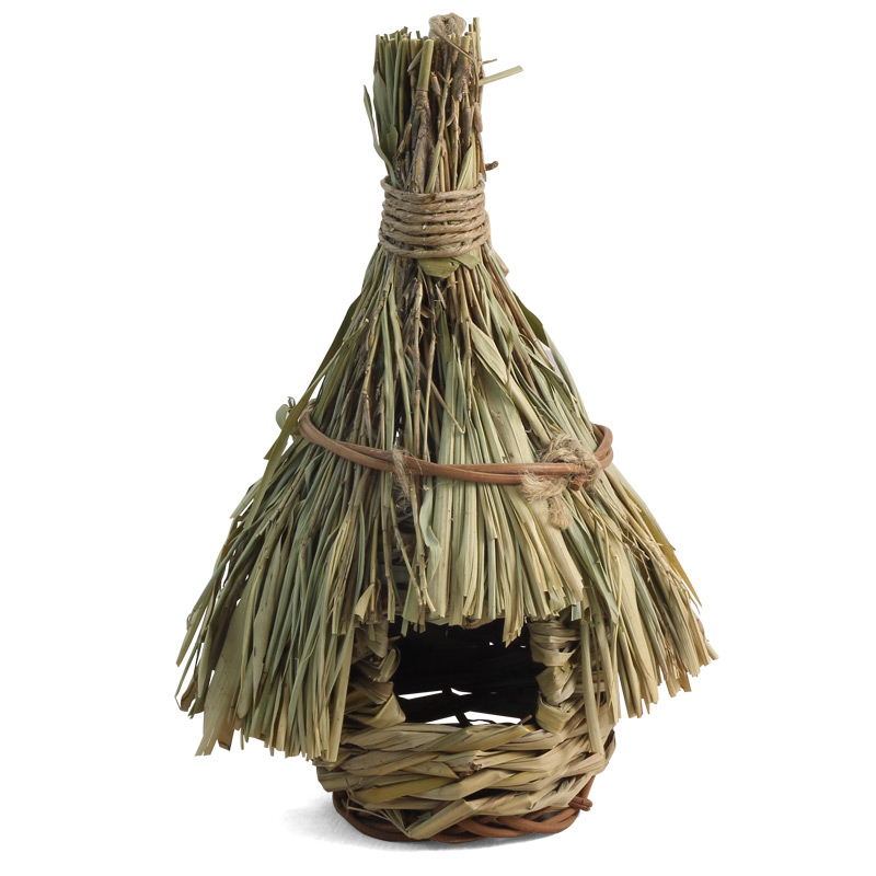 Это оригинальное гнездо-домик с соломенной крышей выполнено из сухих стеблей и листьев луговых трав. Изделие предназначено для птиц малых и средних размеров: канареек, кеноров, волнистых попугаев, амазонов, карелл, розелл и неразлучников. Оно компактно, уютно для питомцев и долго сохраняет тепло. Плотный каркас и обмотка препятствуют разрушению и растаскиванию гнезда птицами. А универсальная форма и габариты изделия оптимально подойдут для семейной пары пернатых питомцев и способствуют быстрому выведению их потомства. Крепление в виде петли. Цвет: соломенный. Размер изделия: d170х260мм.