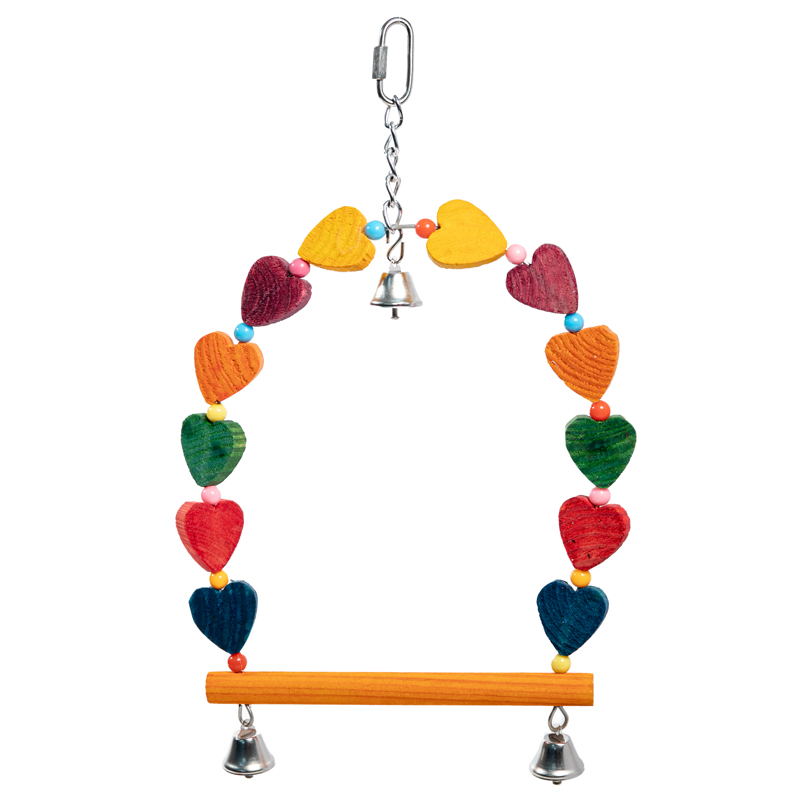 Игрушка для птиц в виде качелей, украшенных деревянными сердечками и двумя колокольчиками. Крепление: карабин. Цвет: разноцветный. Размер: 275/360*185мм.