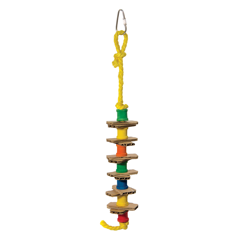 Игрушка для птиц в виде подвешенных на веревке кусочков картона и деревянных катушек. Крепление: карабин. Цвет: в ассортименте. Размер: 300/330*50мм.