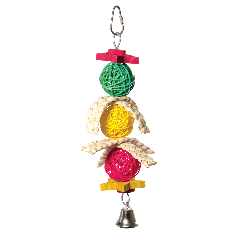 Игрушка для птиц в виде трех плетеных шариков, двух деревянных звезд и колокольчика. Крепление: карабин. Цвет: в ассортименте. Размер: 260/290*110мм.
