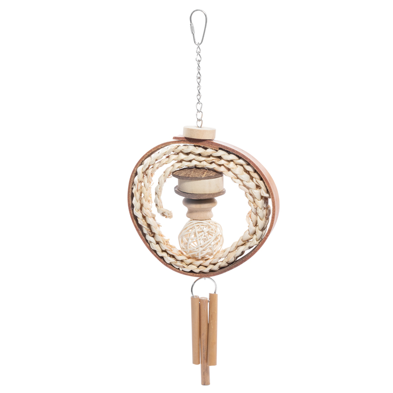 Игрушка NATURAL для птиц выполнена в виде подвески из натуральных материалов: кожаного кольца, бамбуковых трубочек, кукурузных листьев, кокосовых пластин, деревянных деталей и некоторых других. Крепление: карабин. Цвет: соломенный. Размер: 375/410*d150мм.