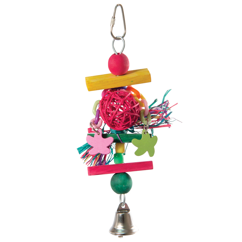 Игрушка для птиц в виде плетеного шара, цветных деревянных деталей и колокольчика. Крепление: карабин. Размер: 210/240*70мм.