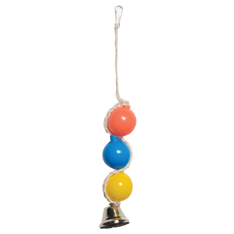 Игрушка для птиц - подвеска в виде 3ех ярких шариков на джутовой веревке с колокольчиком. Цвет: в ассортименте. Размер: 180*30мм.