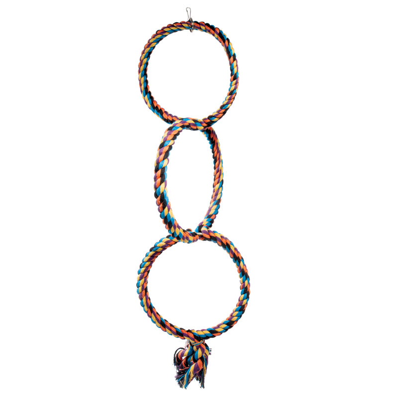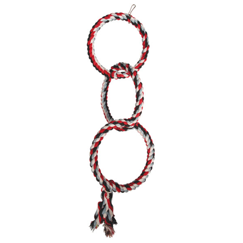 Качели три кольца для птиц с карабином для крепления. Верёвочные игрушки необходимы каждой птице. Птица не только точит когти и клюв, она может лазить по ним, укрепляя мышцы и поддерживая свой организм в тонусе. Верёвочные игрушки вызывают у птиц неподдельный интерес. Размер: d180мм - диаметр одного кольца, 600мм - длина игрушки.