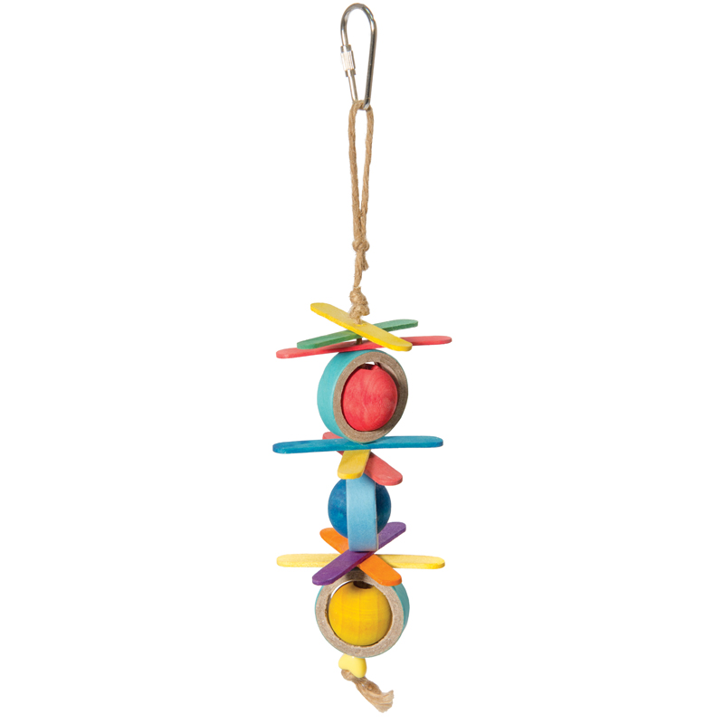 Игрушка для птиц в виде подвески с деревянными шариками в картонных колечках и палочками-вертушками. Крепление: карабин. Цвет: в ассортименте. Размер: 240/270*65мм.