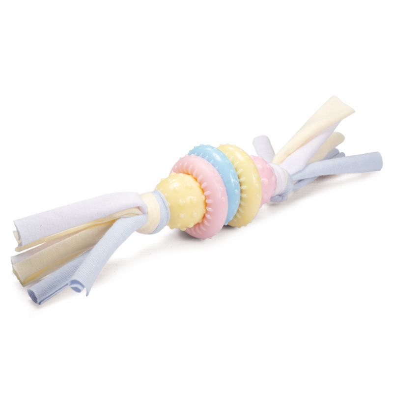 Прочная и гибкая, яркая и оригинальная – эта игрушка станет любимым развлечением для вашего питомца! Изделие выполнено из высококачественных материалов, что гарантирует безопасность животного. Игрушка отлично подходит для тяговых игр с маленьким питомцем, а фактурные кольца из термопластичной резины помогут поддерживать в тонусе жевательные мышцы, укреплять и очищать зубы питомца. Термопластичная резина отличается большей упругостью, эластичностью при низких температурах и более длительным эксплуатационным периодом. Такая резина мало подвержена химическому или термическому воздействию, не токсична и, в результате, обладает гипоаллергенными свойствами. Игрушка легко моется при помощи мыла и не требуют особого ухода. Цвет: сочетание белого, светло-желтого, розового и голубого. Размер изделия: 215 мм, d40мм (кольцо).