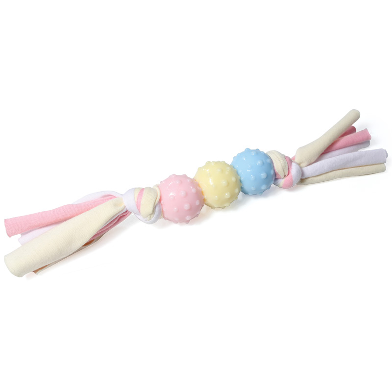 Прочная и гибкая, яркая и оригинальная – эта игрушка станет любимым развлечением для вашего питомца! Изделие выполнено из высококачественных материалов, что гарантирует безопасность животного. Игрушка отлично подходит для тяговых игр с маленьким питомцем, а фактурные мячики из термопластичной резины помогут поддерживать в тонусе жевательные мышцы, укреплять и очищать зубы питомца. Термопластичная резина отличается большей упругостью, эластичностью при низких температурах и более длительным эксплуатационным периодом. Такая резина мало подвержена химическому или термическому воздействию, не токсична и, в результате, обладает гипоаллергенными свойствами. Игрушка легко моется при помощи мыла и не требуют особого ухода. Цвет: сочетание белого, светло-желтого, розового и голубого. Размер изделия: 220 мм, d25мм (мяч).