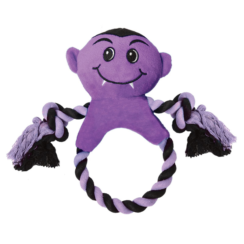 Забавная игрушка для собак "Вампир" несомненно привлечет внимание питомцев и всех окружающих своим необычным дизайном и яркой расцветкой! Игрушка выполнена из мягкого плюша, а крепкая веревка - из хлопка. Благодаря продуманным габаритам изделие удобно носить в зубах, мягкая текстура позволяет питомцу заниматься любимым делом - грызть, кусать и трепать игрушку, а звонкая "пищалка" внутри изделия пробуждает охотничьи инстинкты животного, делая игру еще интереснее. Игрушка "Вампир" доставит огромную радость собакам и их заботливым владельцам и послужит отличным подарком на Хэллоуин. Цвет: фиолетово-черный. Размер: длина - 200мм, диаметр кольца - 105мм