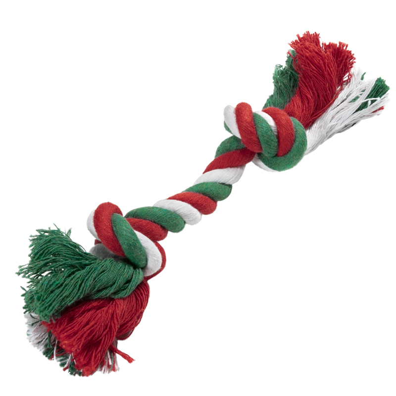 Веревочная игрушка с двумя узлами - лучший способ поздравить четвероногого любимца с праздником! Собаки обожают играть с веревочными игрушками, так как их можно грызть, трепать и носить в зубах. Такие игрушки отлично массируют десны и очищают зубной налет во время игры. Веревки сплетены из нитей натурального хлопка, поэтому безопасны для здоровья питомца. Цвет изделия: микс белого, красного и зеленого. Размер изделия: 300*55*45мм.