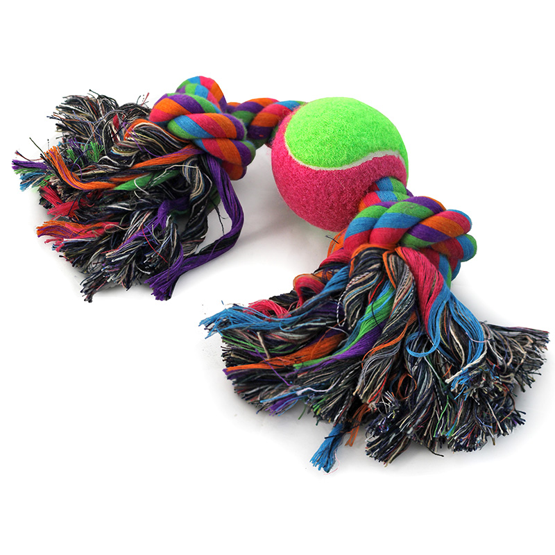 Веревка цветная с двумя узлами и мячом, весит 250-260г. Собаки обожают играть с веревочными игрушками, так как их можно грызть, трепать и носить в зубах. Такие игрушки отлично массируют десны и очищают зубной налет во время игры. Веревки сплетены из нитей натурального хлопка, поэтому безопасны для здоровья Вашего питомца. Цвет: разноцветный. Размер 350мм.