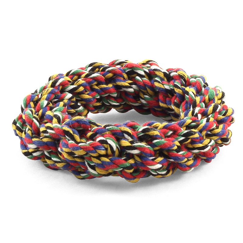 Плетеное кольцо сделано из разноцветных веревок из натурального хлопка, очень прочная игрушка. Способствует тренировке жевательных мышц у собаки. Цвет: разноцветный. Размер d200*40мм.