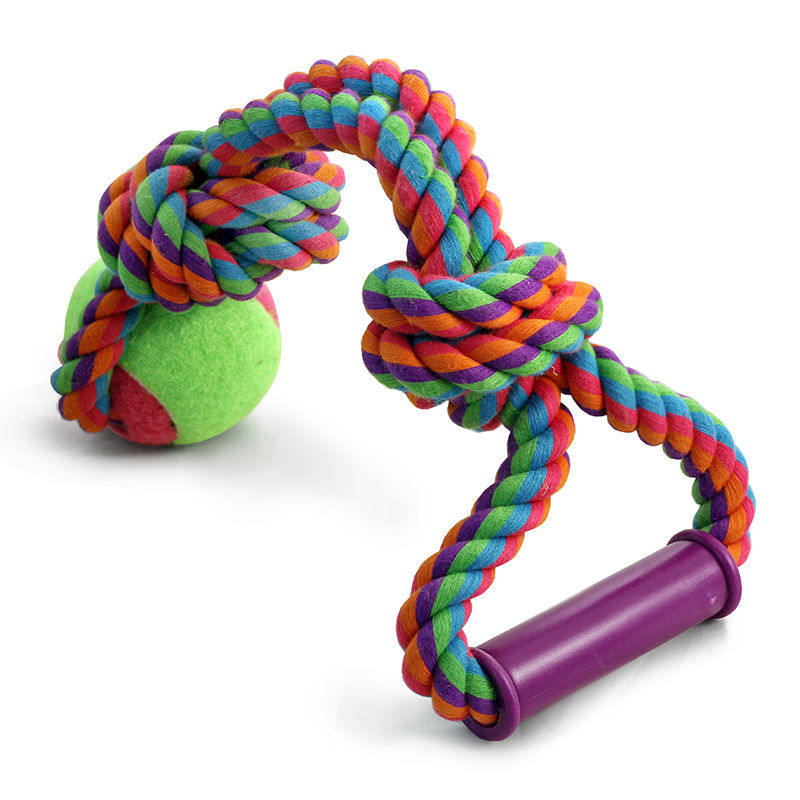 Веревка цветная с двумя узлами и мячом 560г. Предназначена для тяговых игр с собаками крупных пород. Хорошо развивает челюсть собаки. Удобная ручка - противоскользящая. Игры с Вашим питомцем помогают поддерживать его в хорошей форме. Выполнена из 100% натуральных материалов. Цвет: разноцветный. Размер d65*490*160мм.