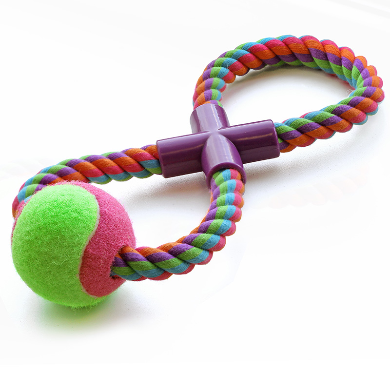 Веревка-восьмерка цветная с мячом 180-190г. Собаки обожают играть с веревочными игрушками, так как их можно грызть, трепать и носить в зубах. Такие игрушки отлично массируют десны и очищают зубной налет во время игры. Веревочные игрушки сплетены из нитей натурального хлопка, поэтому безопасны для здоровья Вашего питомца. Цвет: разноцветный. Размер 295*105*65мм.