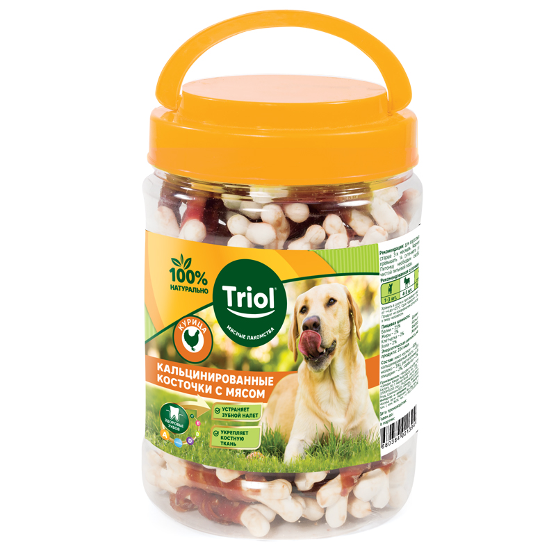 Кальцинированные косточки с курицей для собак, 450г (банка), Triol