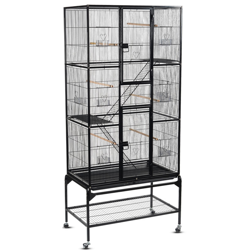 Прочная, эффектная и функциональная стальная клетка на колесах, предназначенная для птиц и попугаев крупных размеров. Эмалированные прутья не гнутся, не облупляются и не гремят. Клетка имеет большую удобную дверцу, надежно запирающуюся на плотный замок, а ее комплектация включает 6 кормушек, 6 жёрдочек, 2 полочки и 2 лесенки. Такая клетка займет достойное место в любом интерьере, отвечая всем жизненным потребностям пернатых питомцев. Клетка также оборудована специальным выдвижным поддоном, облегчающим процесс уборки. Цвет: черный металлик. Размер изделия: 810х470х1760мм.