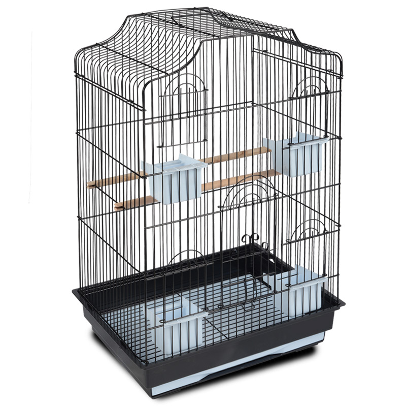 Оригинальная клетка для птиц с фигурной крышей - полезный аксессуар для владельцев пернатых питомцев. Прочная, стильная и удобная, такая клетка займет достойное место в любом интерьере, отвечая всем жизненным потребностям пернатых питомцев. В комплектацию изделия входят 2 кормушки-поилки, 2 жердочки. Клетка также оборудована удобной ручкой для переноски и специальным пластиковым наружным поддоном, облегчающим процесс уборки. Цвет: черный. Размер изделия: 470х360х680мм.