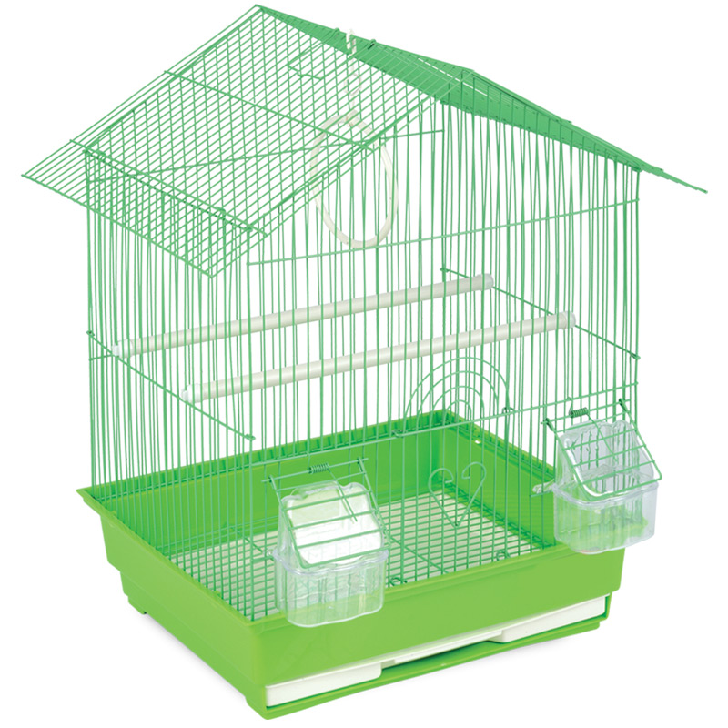 Оригинальная клетка для птиц с фигурной крышей - полезный аксессуар для владельцев пернатых питомцев небольшого размера. Прочная, стильная и удобная, такая клетка займет достойное место в любом интерьере, отвечая всем жизненным потребностям пернатых питомцев. В комплектацию изделия входят 2 кормушки-поилки, 2 жердочки и качели. Эмалированная клетка также оборудована удобной ручкой для переноски и специальным пластиковым наружным поддоном, облегчающим процесс уборки. Размер изделия: 350х280х460мм.