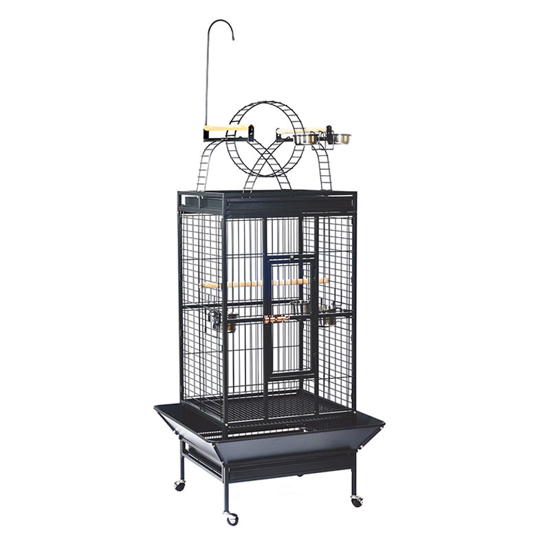 Прочная, эффектная и функциональная стальная клетка на колесах, предназначенная для птиц и попугаев крупных размеров. Прутья не гнутся, не облупляются и не гремят. Клетка имеет большую удобную дверцу, надежно запирающуюся на плотный замок, а ее комплектация включает пластиковые кормушки -поилки и деревянные жердочки, а также - за счет дополнительной внешней конструкции - предусматривает возможность выгула птиц прямо на крыше изделия. Такая клетка займет достойное место в любом интерьере, отвечая всем жизненным потребностям пернатых питомцев. Клетка также оборудована специальным выдвижным поддоном, облегчающим процесс уборки. Цвет: черный металлик. Размер изделия: 830х770х1780мм.