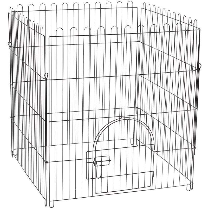 Клетка для животных эмалированная. Размер между прутьями 34,9мм. В комплекте 4 панели, одна из них с металлической дверцей, с надежным защищенным запором-задвижкой, которая открывается на 180 градусов, плотно прижимаясь к стенке. Конструкция получается надежная, секции соединяются между собой при помощи штыря-спицы, которая входит в специальные ушки на краях секций (вдоль боковой стороны). Высота дверцы вольера 40 см от нижней планки, 45 см от пола. Подходит для кошек, собак, кроликов и других животных. Вольер идеально подходит для отдыха на природе и ограничения передвижения по квартире. Цвет прутьев: черный, белый. Размер одной секции: 840*950мм. Размер в сложенном виде: 900*150*90мм.