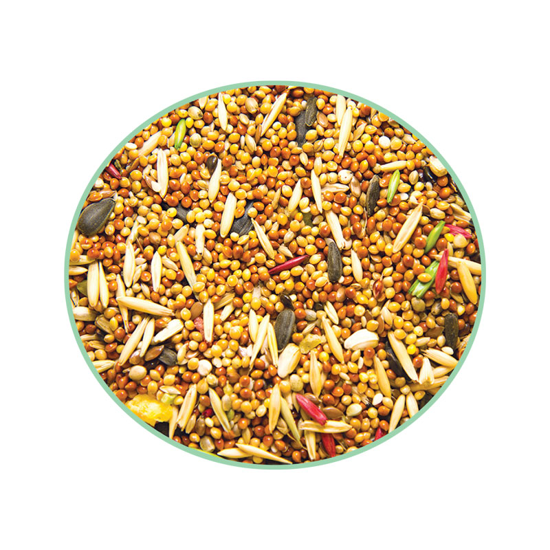 Состав: Просо белое, просо красное, рапс, овёс, овёс очищенный, канареечник, лён, конопля, суданка, семена подсолнечника, сорго, сафлор, чумиза, пшено, кунжут, витаминный комплекс