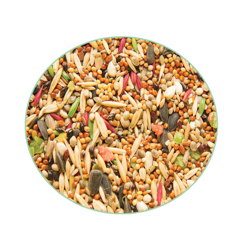 Состав: Просо белое, просо красное, овёс, овёс очищенный, канареечник, семена подсолнечника, лён, конопля, суданка, сорго, сафлор, цукаты, кунжут, витаминный комплекс