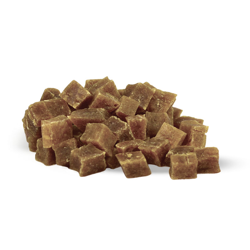 Состав: мясо утки - 79%, кукурузный крахмал - 8.5%, арахисовый белок - 4.7%, сорбитол - 4%, глицерин - 3.5%, соль - 0,2%, сорбат калия - 0,1%