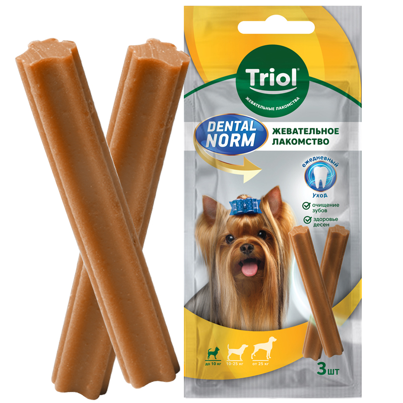 Лакомство для собак DENTAL NORM - это простой и эффективный уход за полостью рта. Зубной камень у собак - распространенное явление, особенно у животных старше трех лет. Поэтому важно знать, как избавиться и предотвратить его появление. Ежедневное употребление лакомств DENTAL NORM от TRIOL помогает снизить риск заболеваний полости рта, качественно очистить зубы, уменьшить налет и освежить дыхание.