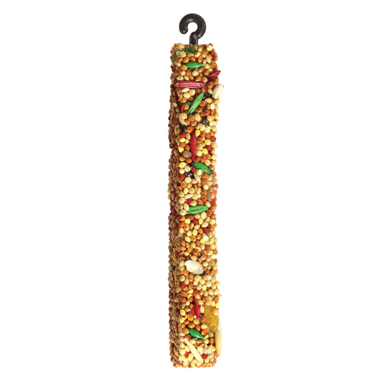 Лакомство для волнистых попугаев с фруктами: две палочки лакомства запаяны в полиэтиленовый пакет и уложены в картонную коробочку.
