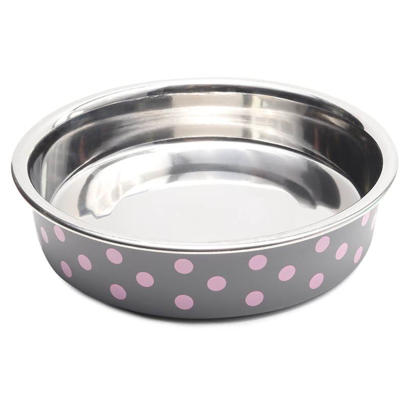 Стильная круглая миска из нержавеющей стали для кошек и собак небольших пород. Она идеально подходит как для воды, так и для корма разной консистенции. Миска комфортна для питомца и легко моется под струей проточной воды с использованием моющих бытовых средств. Прорезиненное основание обеспечивает максимальную устойчивость, препятствуя скольжению изделия во время использования, а оригинальный принт сделает такую миску украшением любого интерьера. Цвет изделия: темно-серый. Объем: 0,45л. Размеры: 135*135*45мм.