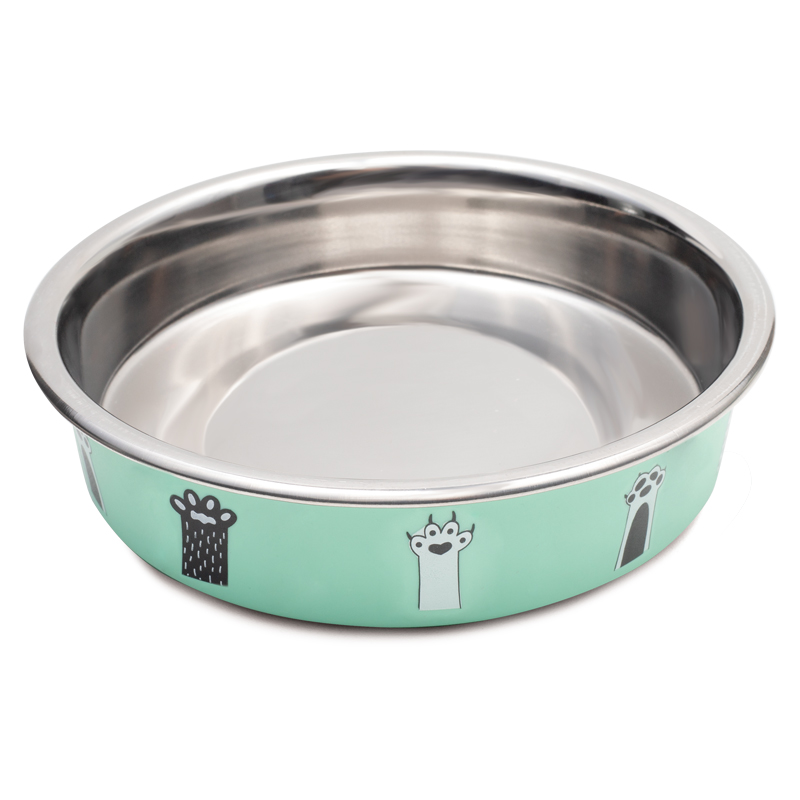Стильная круглая миска из нержавеющей стали для кошек и собак небольших пород. Она идеально подходит как для воды, так и для корма разной консистенции. Миска комфортна для питомца и легко моется под струей проточной воды с использованием моющих бытовых средств. Прорезиненное основание обеспечивает максимальную устойчивость, препятствуя скольжению изделия во время использования, а оригинальный принт сделает такую миску украшением любого интерьера. Цвет изделия: мятный. Объем: 150 мл. Размеры: 110*110*30мм.