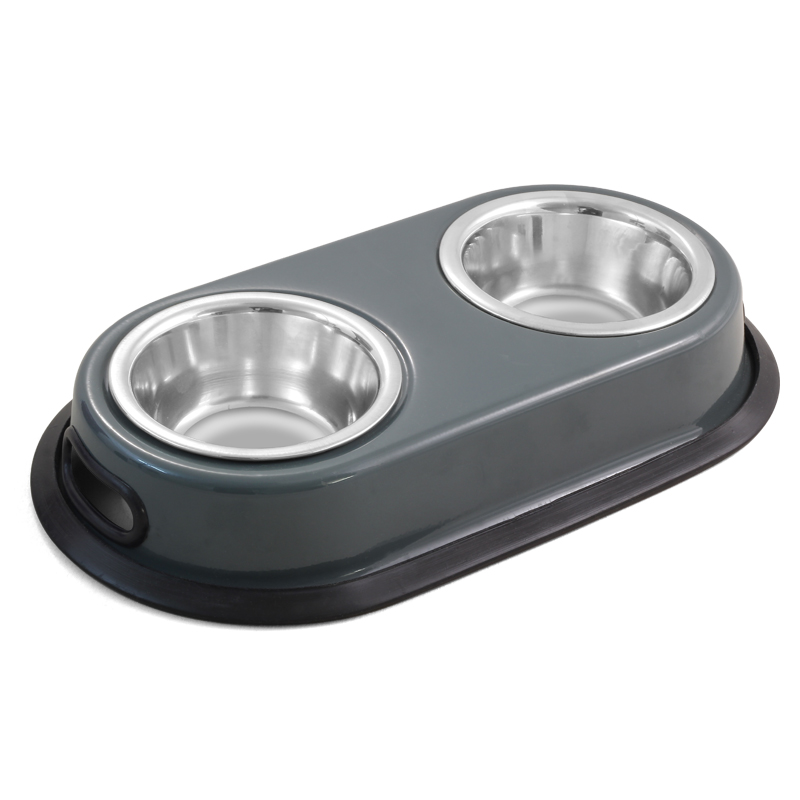 Двойная металлическая миска для собак - всегда актуальный аксессуар для вашего четвероного питомца. Такая миска - идеальный способ обеспечить своего любимца одновременно и кормом, и свежей водой. Устойчивая платформа на резиновой основе надежно фиксирует на месте и не позволит содержимому расплескаться, а сквозные боковые "ручки" делают эксплуатацию изделия максимально комфортной. Изделие комфортно для использования и легко моется под струей проточной воды с использованием моющих бытовых средств. Цвет изделия: серый. Объем: 2*0,2л. Размеры подставки: 330х180х50мм. Размеры мисок: 2*d110x40мм.