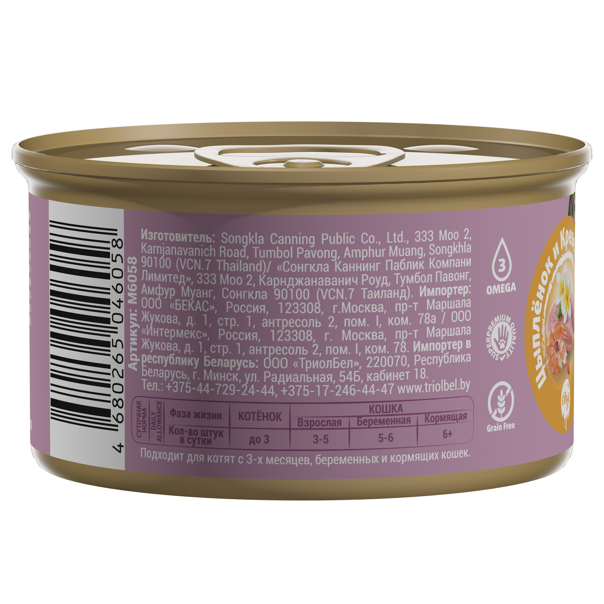 Состав: Мясо цыплёнка 35%, креветки 10%, вода, загустители.