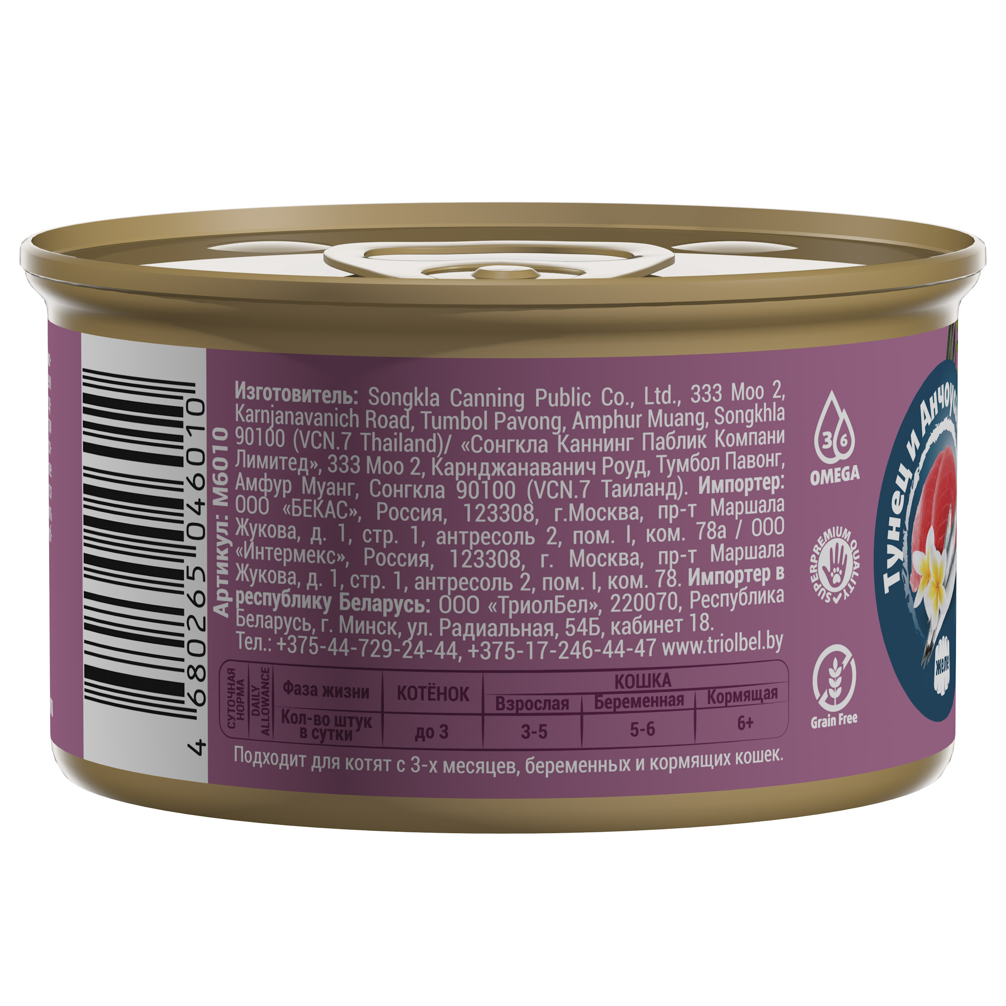 Состав: Тунец 45%, анчоусы 5%, масло тунца 0,61%, вода, желирующий агент.