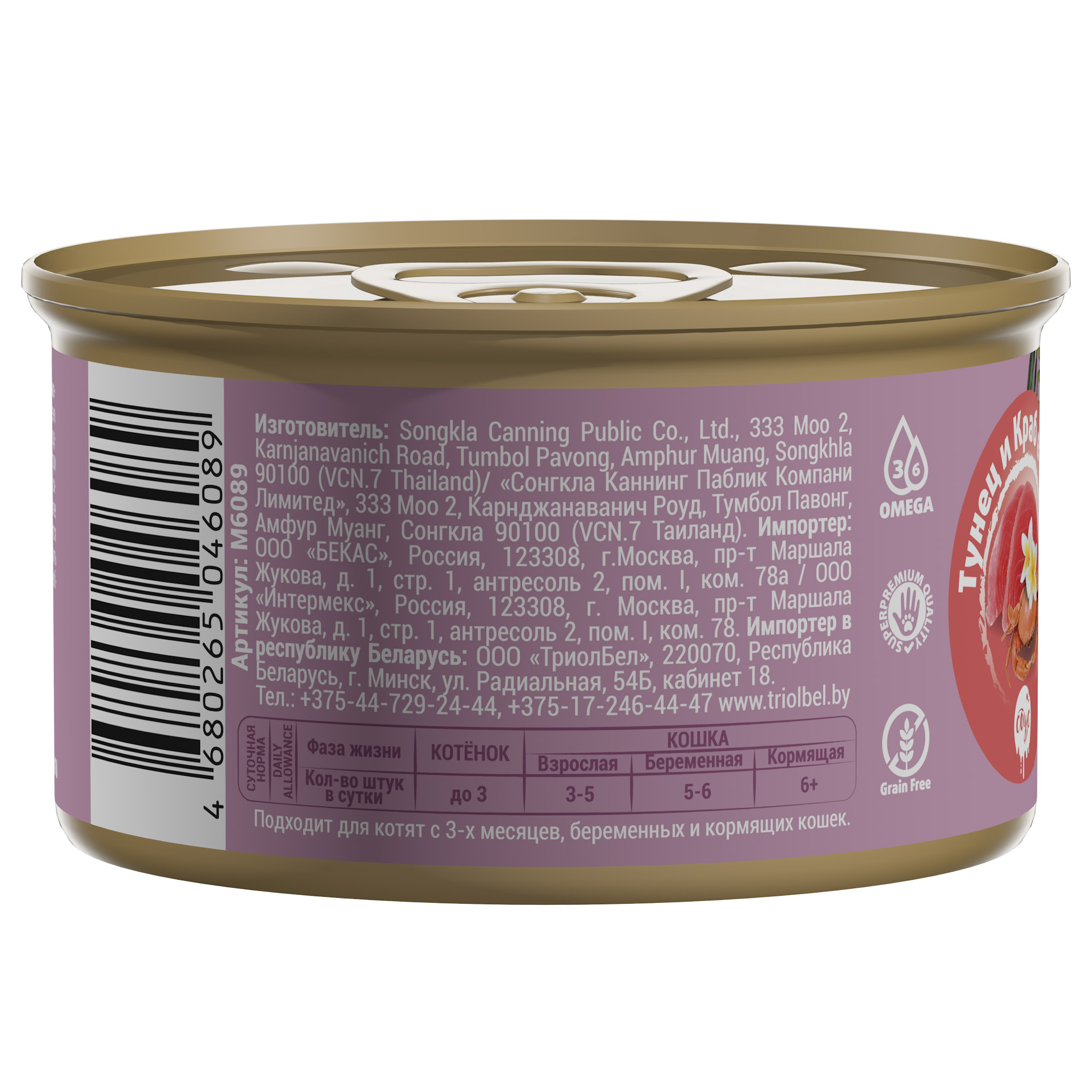 Состав: Тунец 35%, краб 10%, масло тунца 0,61%, вода, загустители.
