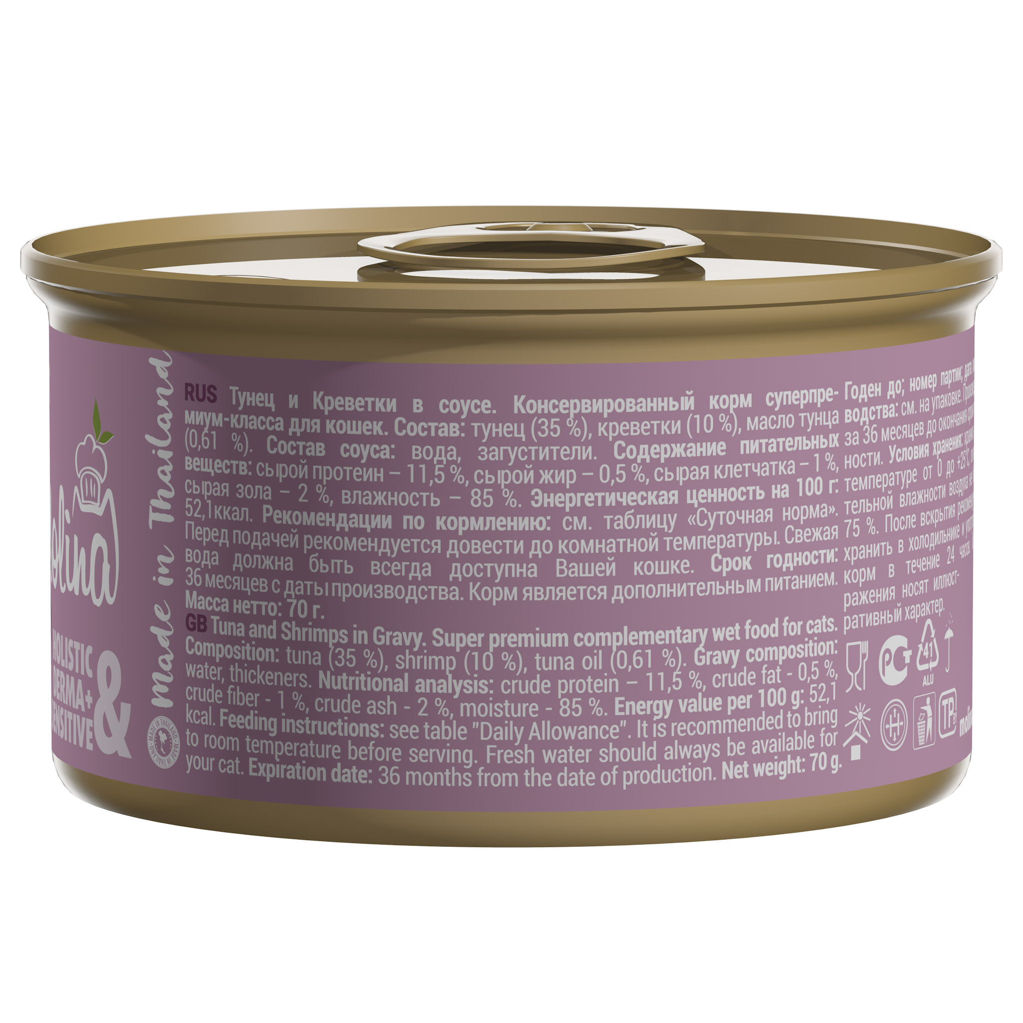 Дополнительное питание класса Holistic, консервы с Тунцом и Креветками в соусе для взрослых кошек.
