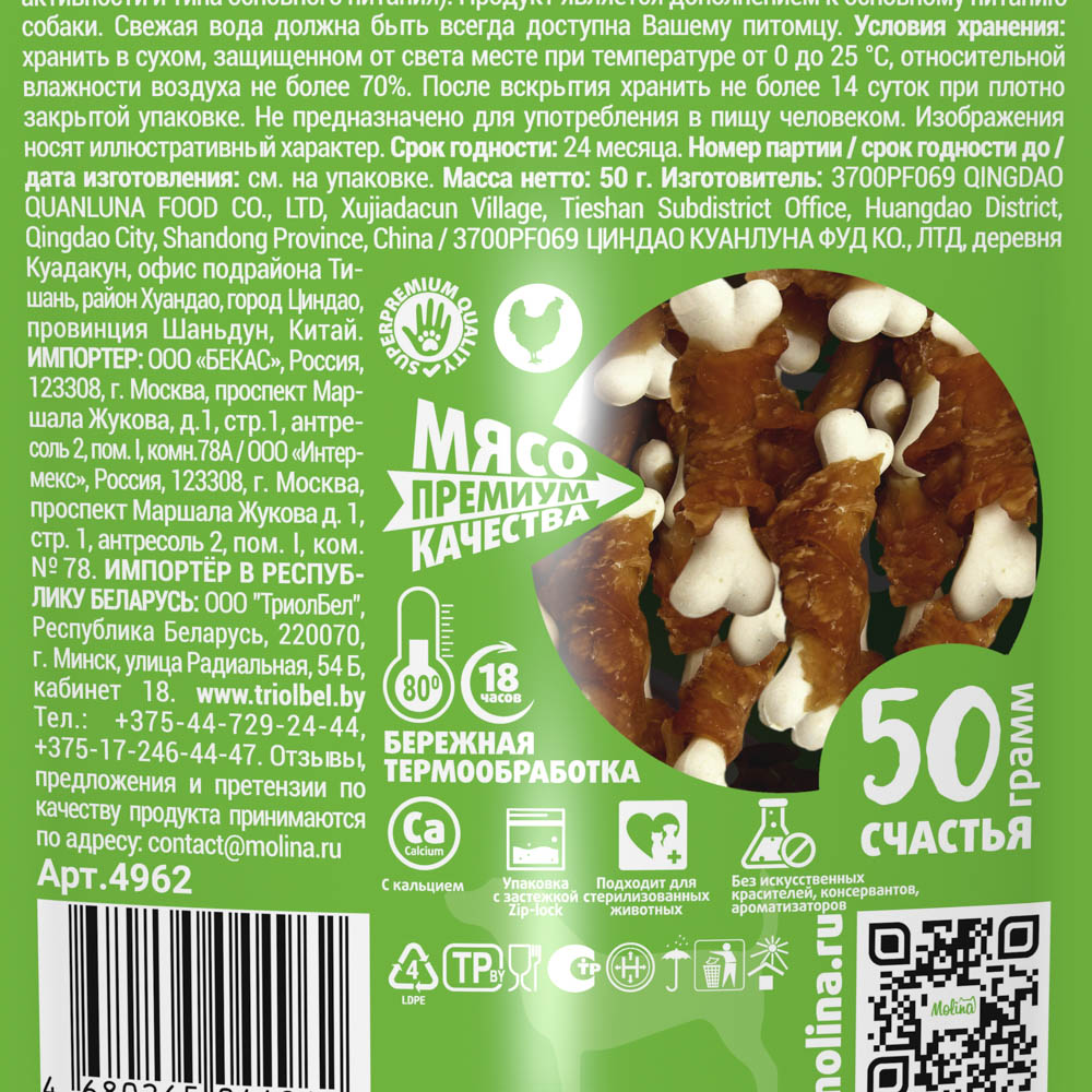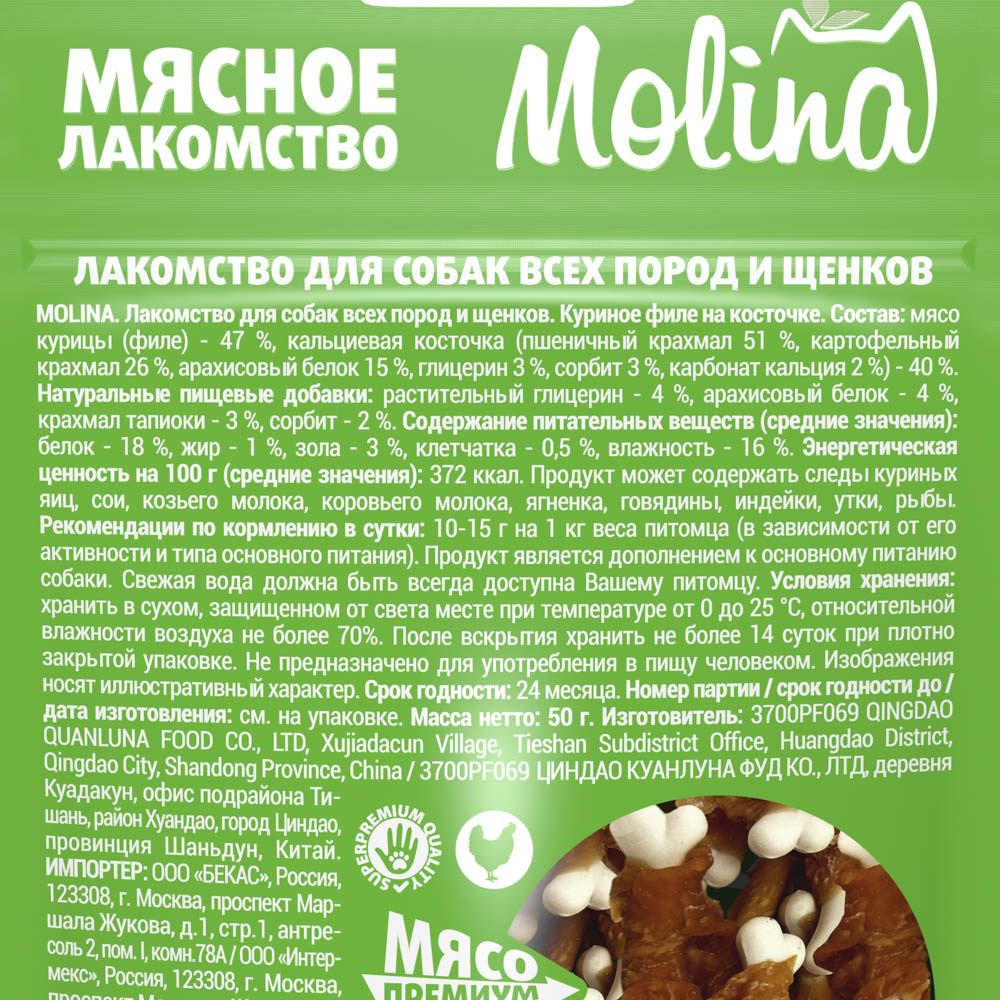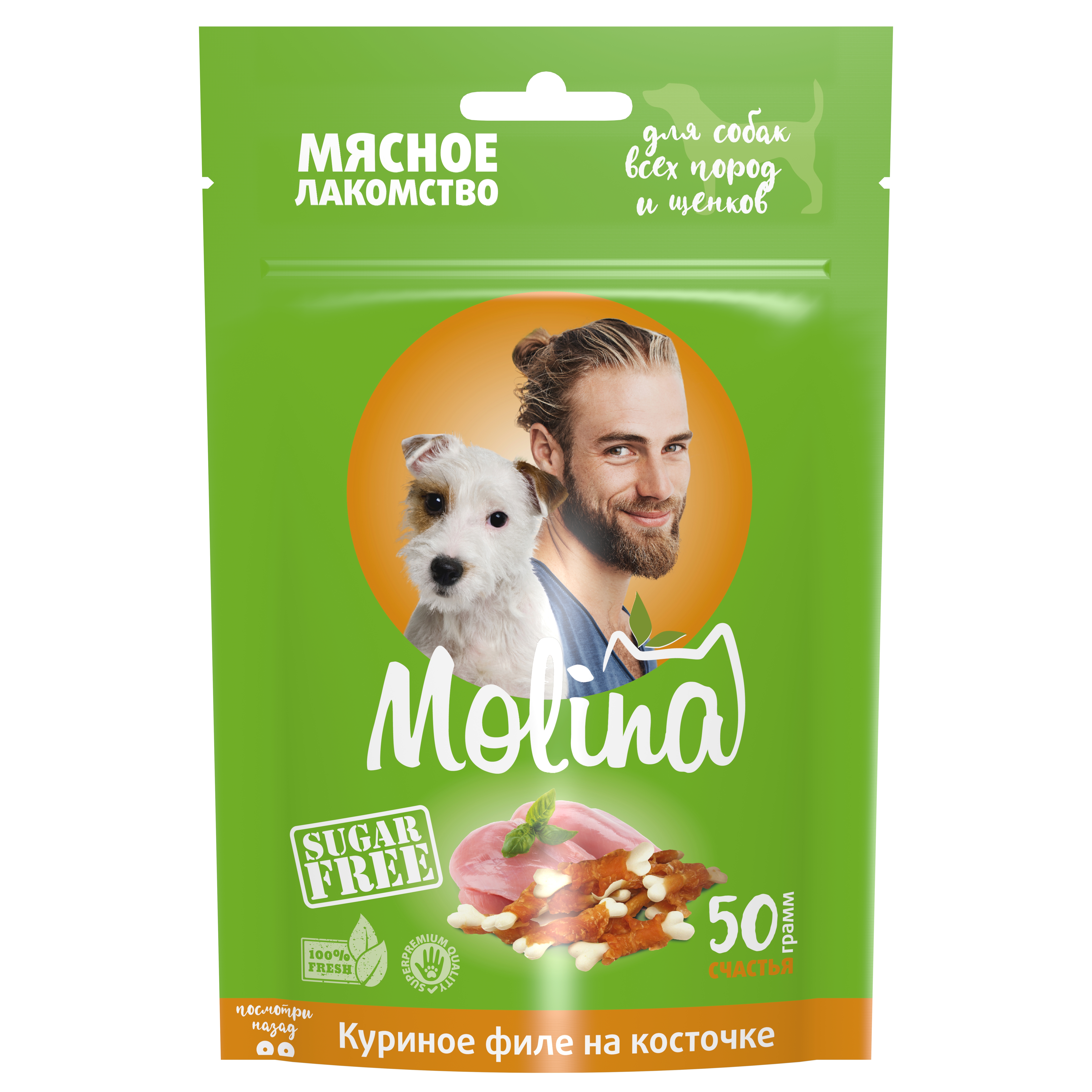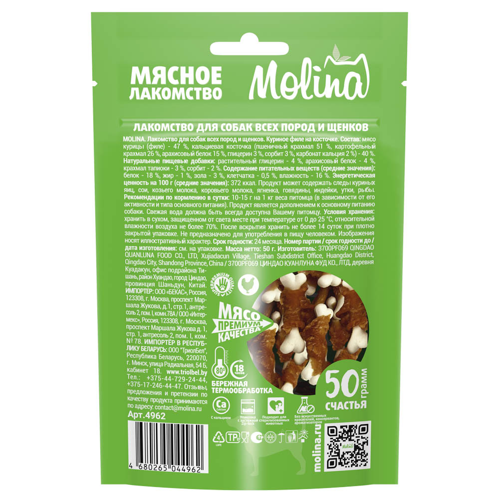 MOLINA, Лакомство для собак всех пород и щенков, Куриное филе на косточке, 50 г, 4962