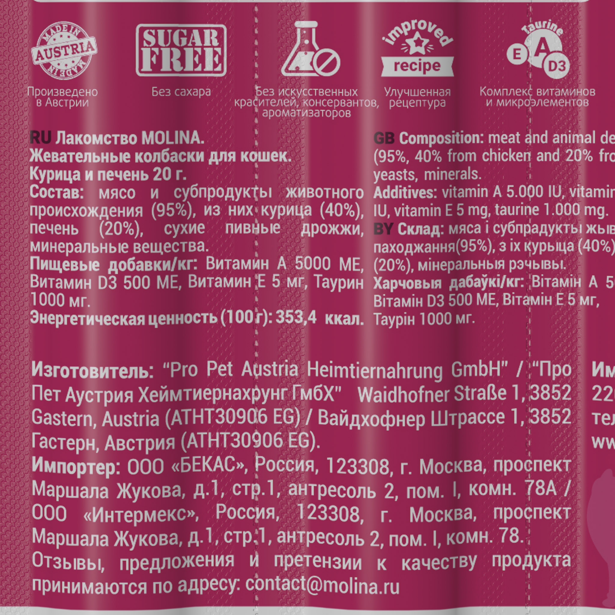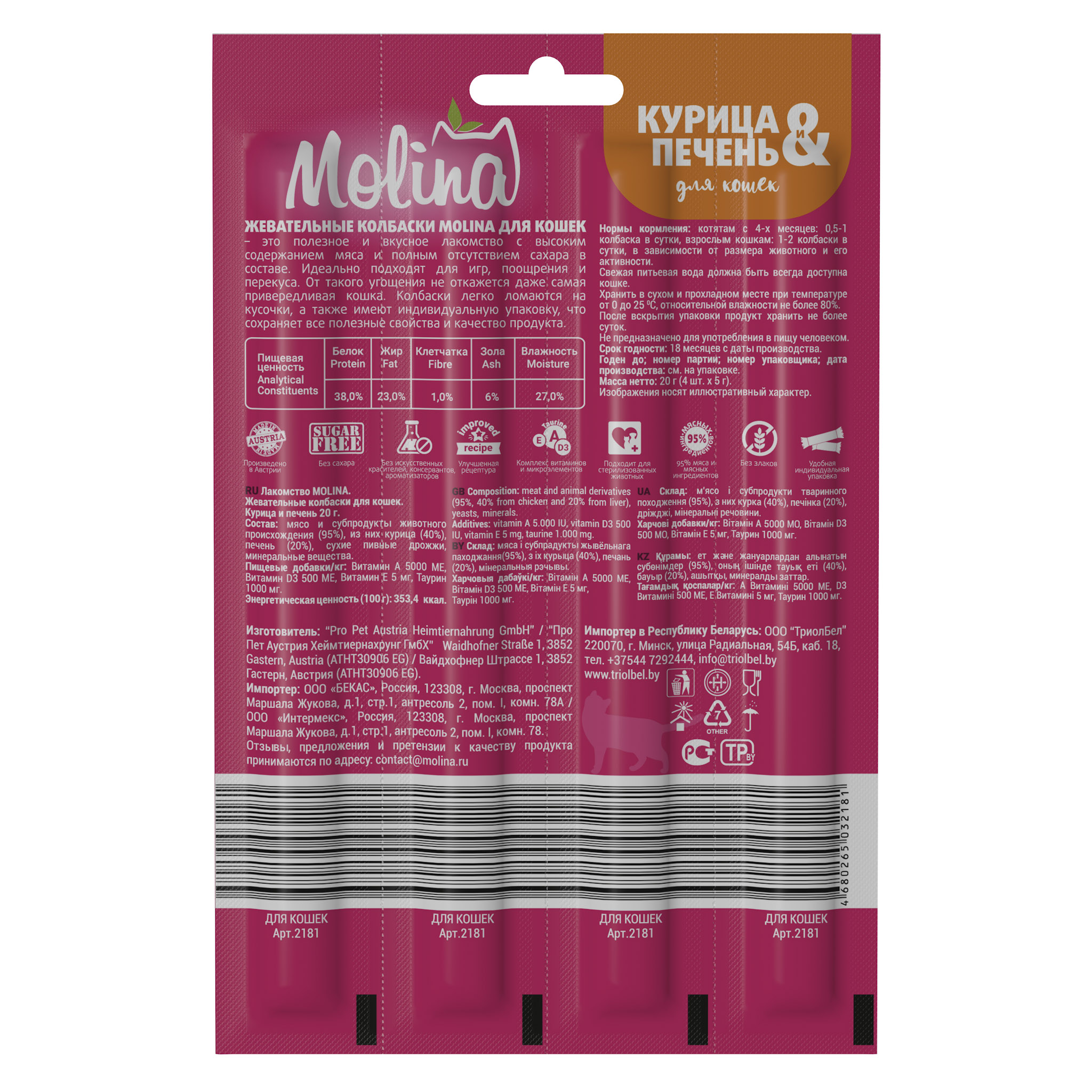 MOLINA,Жевательные колбаски для кошек, Курица и печень,20 г,2181