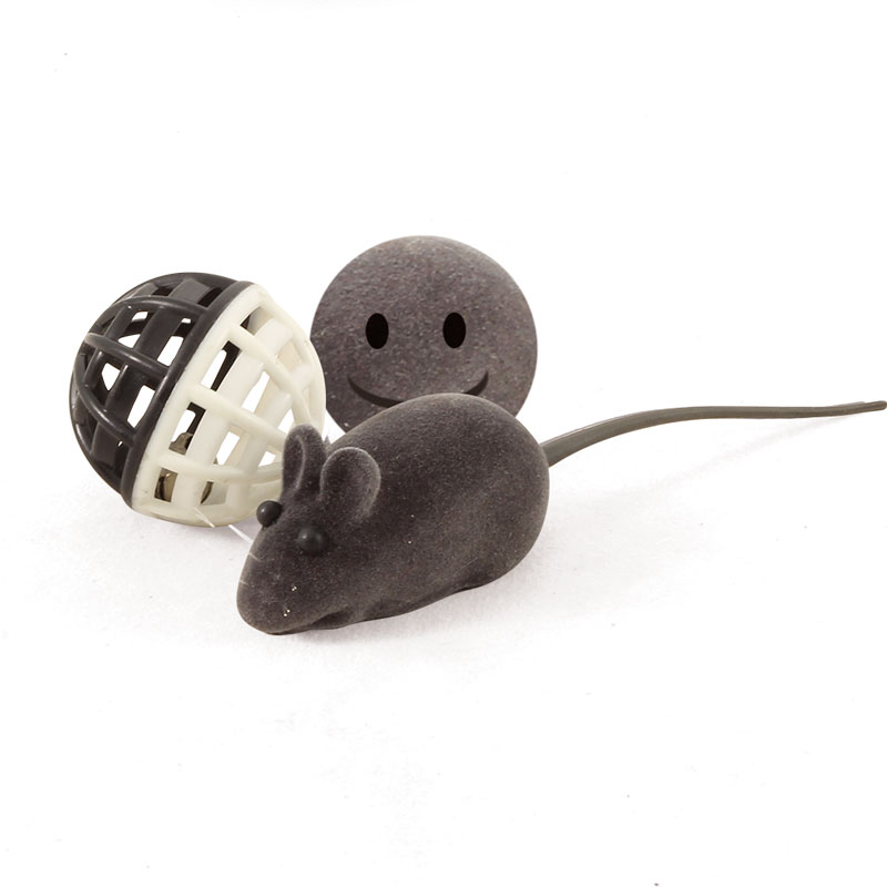 Этот набор из трех ярких и функциональных игрушек - отличный вариант для активной и разнообразной игры с пушистыми питомцами. В комплект входят: мячик пластиковый сетчатый черно-белый с колокольчиком (d45мм); мягкий серый велюровый мячик с принтом смайлика и пищалкой (d37мм); серая велюровая мышка с пищалкой (60х23х27/130мм). С такими игрушками маленькие котята хорошо развиваются, а взрослые животные - держат себя в тонусе и оттачивают охотничьи навыки. Набор упакован в прозрачный пакет в клапаном.