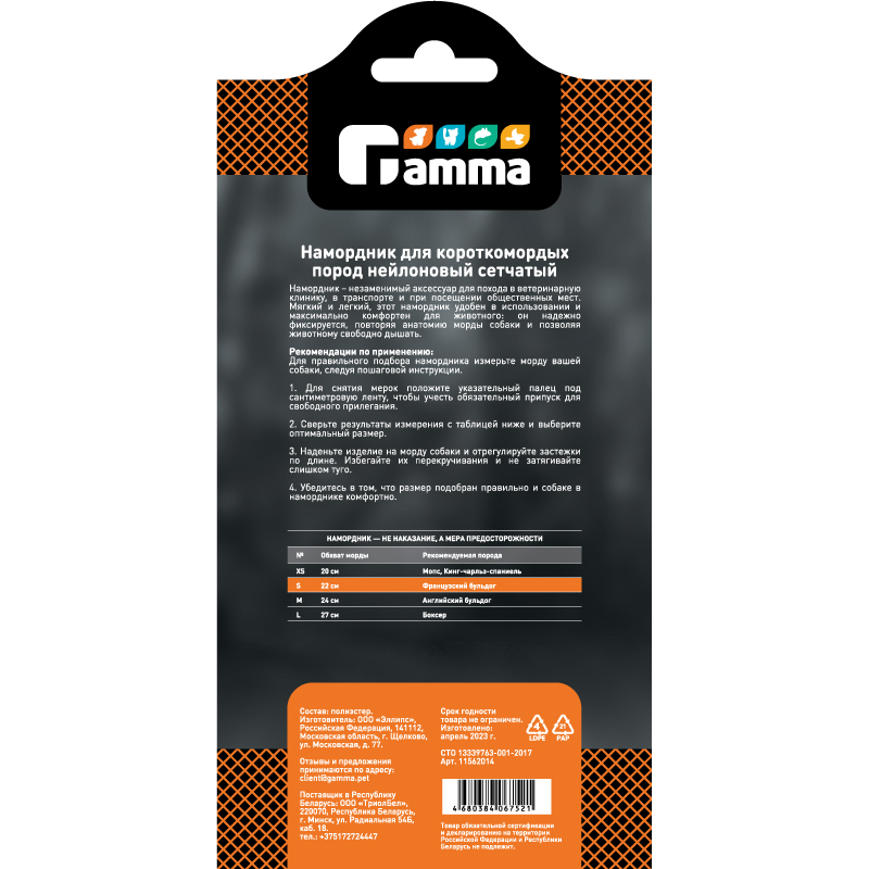 Намордник для короткомордых пород нейлоновый сетчатый S, Gamma