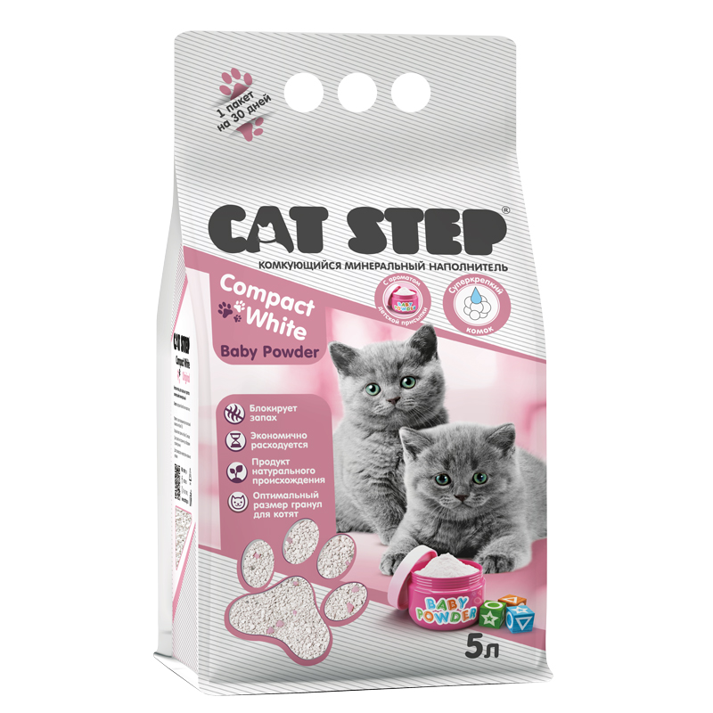Наполнитель для котят комкующийся минеральный CAT STEP Compact White Baby Powder, 5 л