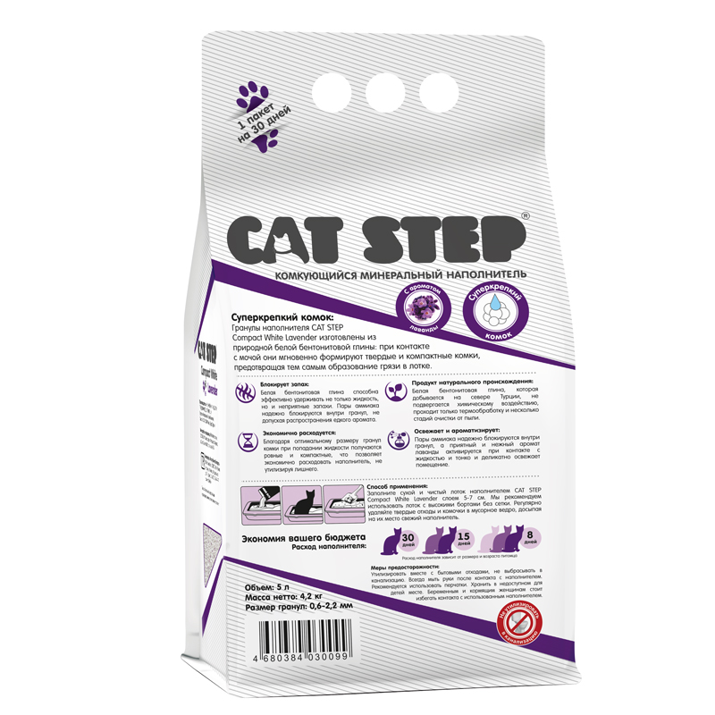 Гранулы наполнителя CAT STEP Compact White Lavender изготовлены из природной белой бентонитовой глины: при контакте с жидкостью они мгновенно формируют твердые комки, предотвращая образование грязи в лотке и эффективно удерживая запахи. Благодаря оптимальному размеру гранул комки получаются ровные и компактные, что позволяет экономично расходовать наполнитель, не утилизируя лишнего. Белая бентонитовая глина, которая добывается на севере Турции, не подвергается химическому воздействию, проходит только термообработку и несколько стадий очистки от пыли. Приятный и нежный аромат лаванды тонко и ненавязчиво освежает помещение. Заполните сухой и чистый лоток наполнителем CAT STEP Compact White Lavender слоем 5-7 см. Регулярно удаляйте твердые отходы и комочки, при необходимости досыпайте свежего наполнителя. Рекомендуем использовать лоток с высокими бортами без сетки. Не утилизировать в канализацию. Размер гранул: 0,6-2,2 мм.