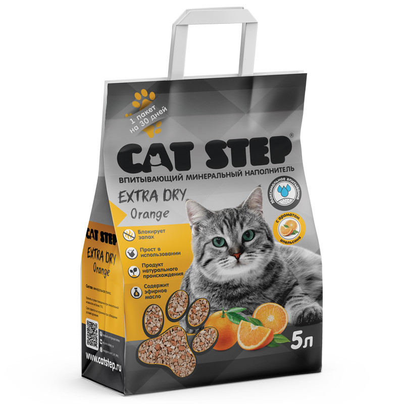Впитывающий наполнитель CAT STEP Extra Dry Orange изготовлен из натуральной глины, которая добывается в солнечной Италии. Сырье для впитывающего наполнителя высушивается при высоких температурах, что обеспечивает высокую впитываемость и эффективную блокировку неприятных запахов внутри гранул. Гранулы наполнителя эффективно поглощают жидкость в больших объемах, оставляя лоток сухим и не прилипая к лапкам животного. Наполнитель идеален для владельцев домашних животных с дефицитом свободного времени для ухода за кошачьим лотком. 100% экологически чистый продукт: не проходит химической обработки и безвреден для окружающей среды. Содержит эфирное масло апельсина - это натуральное дезинфицирующее средство, которое наполнит помещение легким цитрусовым ароматом. Заполните сухой и чистый лоток наполнителем CAT STEP Extra Dry Orange слоем 3-5 см. Регулярно удаляйте твердые отходы, при необходимости досыпайте свежего наполнителя. Подходит для всех типов лотков. Не утилизировать в канализацию. Объем: 5 л
