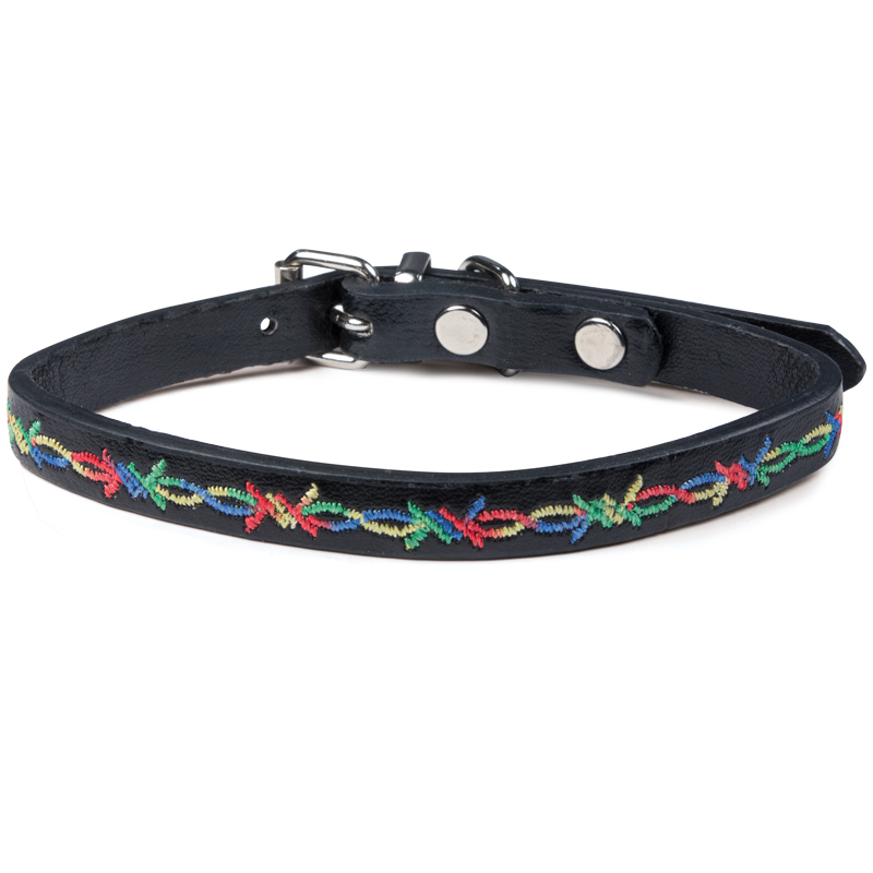 Ошейник из искусственной кожи с оригинальным дизайном в виде этно вышивки - стильный и функциональный аксессуар для кошек и собак мелких пород. Изделие выполнено с использованием крепкой металлической фурнитуры и изящного декора. Длину изделия удобно подгонять под индивидуальные параметры животного, а прочное основание ошейника отлично подойдет для крепления поводка, адресника или других аксессуаров. Размеры изделия: 10*310мм. Цвет: черный.